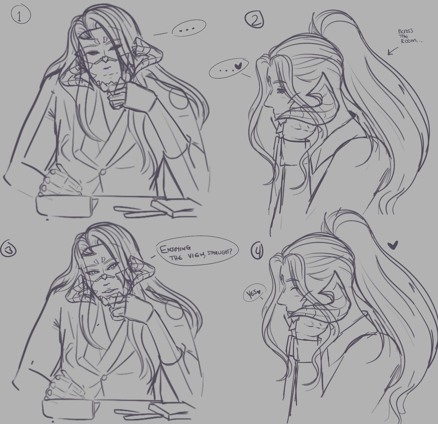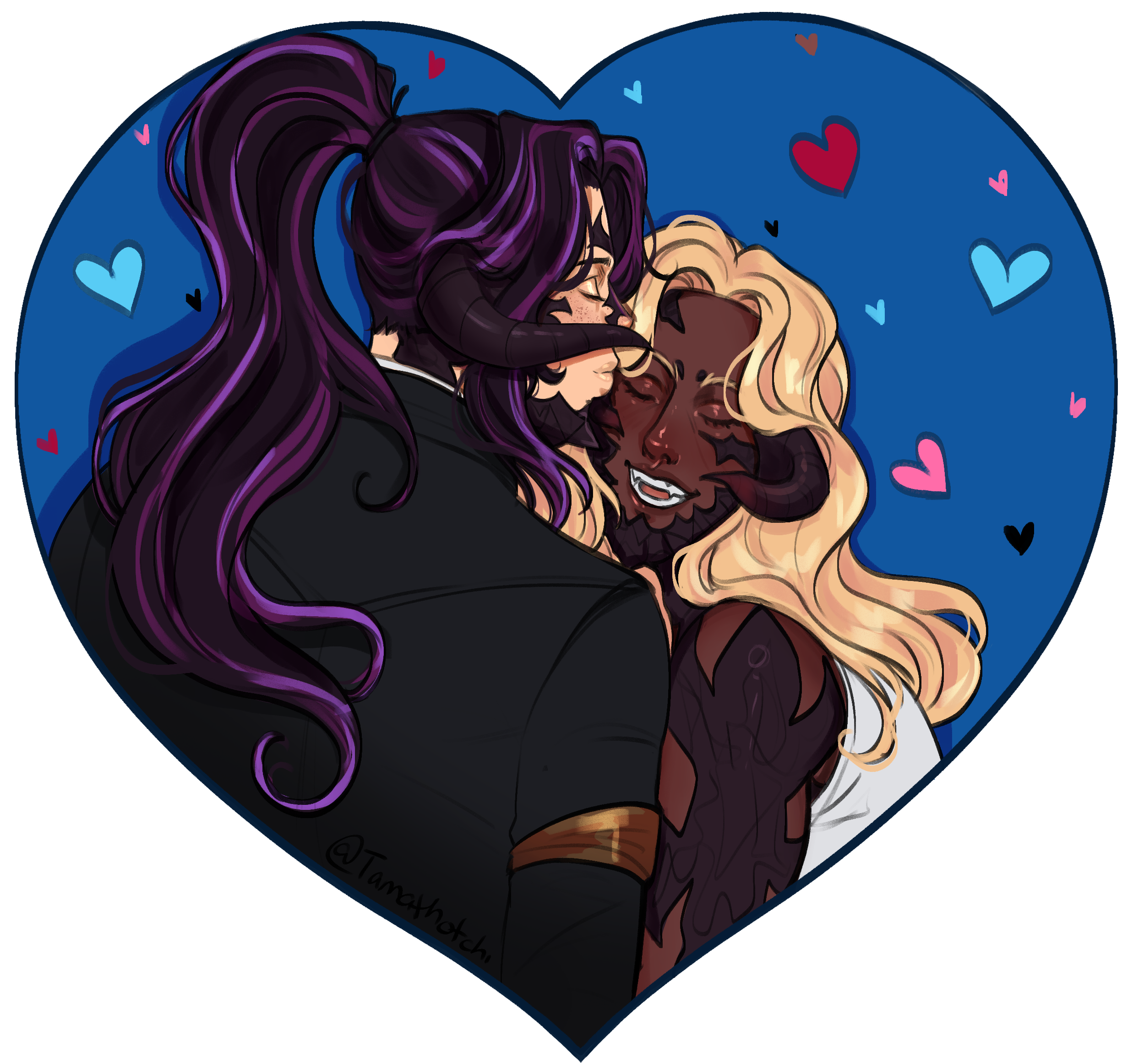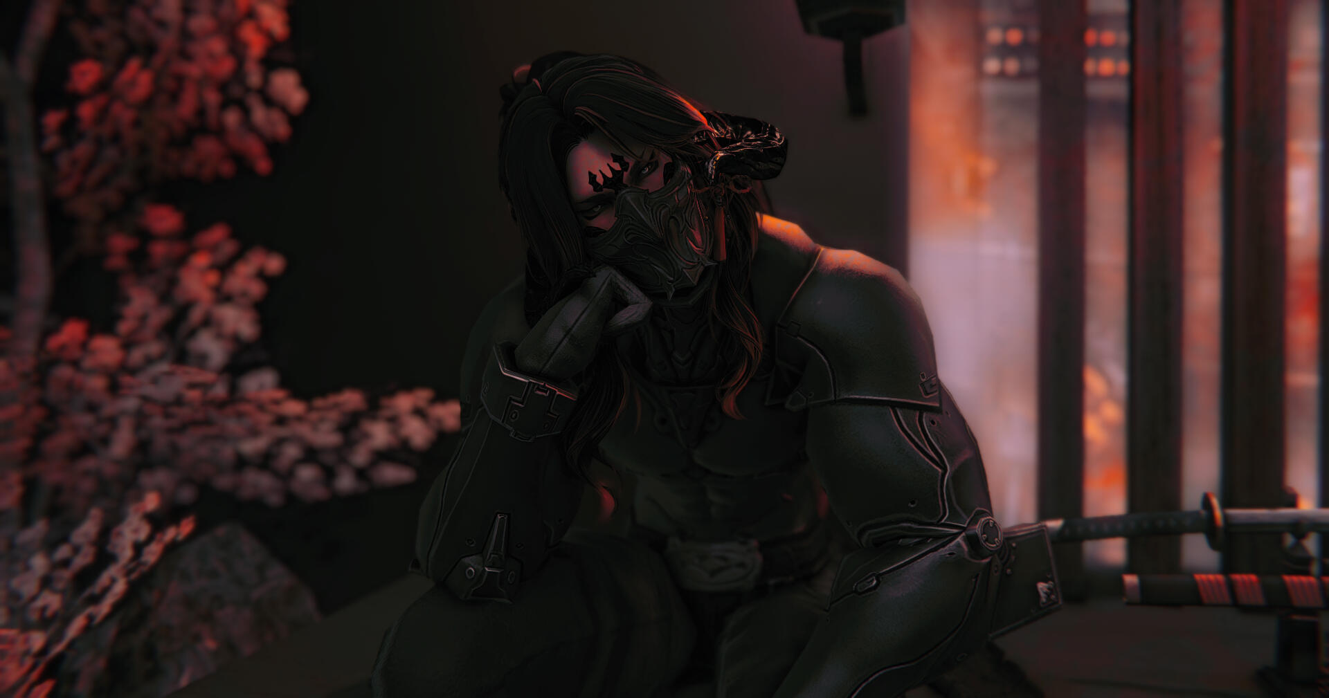 He had been living in Gridania for five years before he met Katsu. He took a job posting from the board that had a meeting place and time and paid well, which brought him to the Quicksands in Ul'Dah. While he waited, he happened to sit right across from another Xaela, though he couldn't see him at the time. To make a long story short, they hit it off instantly, meeting again and again after that, finding conversation easier with him than Zamis had found with anyone else. Being with Katsu was the first true ray of Sun he'd felt since he lost his sight, and despite all the walls he tried to build and the fear that permeated that scar in his heart, Katsu was the third person Zamis fell in love with.Through Katsu's friend, Tai, they found a way to treat Zamis' eyes, treating his lifelong ailment. In the end it succeeded and soon enough Zamis could take off his blindfold for the last time, never needing to wear it again.Despite his voidsent's influence and attempts in trying to prevent it, more of Katsu's connections led him to the opportunity to extract his voidsent. It was a terrible process, testing the true limits of his and Katsu's relationship and the extent of what his body could handle, but the pain and heartache was more than worth it. Something he never thought was possible became possible- he had finally rid himself from Shal. A little piece of his voidsent remained, but it stayed locked away within him, never to be summoned again.The process didn't come without consequences, however. All the scarring he'd accrued when Shal had taken him over in the Thirteenth remain permanent, sensitive to the slightest touch. He keeps bandages on them to avoid anything, including cloth, making contact. He went blind in the eye used to seal Shal's contract, a side effect that medicine can't fix. Though he kept his height and bulk, he lost his sharp rows of fangs, turned back into his regular set of pointed canines and mandibles. He kept his claws and altered tongue, but lost the purple glow of his scales. Zamis considers all his physical changes and detriments a welcome exchange for the silence and peace it brought back to his mind.He now lives his days as a bartender, still taking odd jobs when he can. He runs his own secretive underground organization, bringing people with the same purpose together into a small community he often calls his home away from home. Though far less honest than his on-paper jobs, he built it from the ground up himself, and has found great success. He is far happier than he's ever been, recently married to Katsu, the man that helped him through his lowest points, despite going through a series of unfortunate mishaps leading to their impromptu wedding. He is ever distrustful of strangers, now more than ever, but those he holds close know him for who he really is- a big, goofy guy who loves to listen to stories as much as he loves to tell them. He is far happier than he could ever remember being, and knows that this time, it will last.