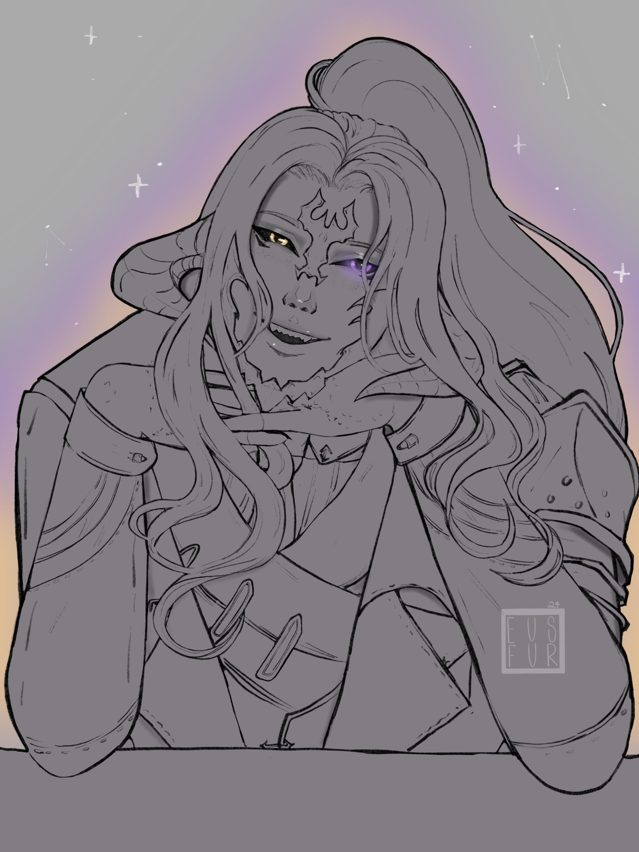 He'd gotten into many fights, and knew just how dangerous it was. So when he heard that yell, he was instantly up and grabbing his weapon- a blade he had found discarded long ago in a ruin- and rushed to the noise, his panic rising. He knew that voice like the back of his hand, and knew [REDACTED] was in trouble.He came upon the scene, crushing panic and shock filling him at the sight. There was his partner, bloodied and torn to pieces, slashes running down his body like a large animal had clawed into him in one fell swipe. Zamis ran to his side, desperately checking for a pulse. By some miracle, he felt a faint thread of a heart beat, but knew there wasn't much he could do to save him in this state. He hung his head, choking back acceptance of the other's fate, when he heard Shal's voice behind him. It was a voice that still haunts his dreams to this day, the coldness and touch of delight so misplaced in the sight of such tragedy. "You know we can save him. Accept the deal."Despite his partner quickly dying in front of his eyes, Zamis hesitated. For the years he'd been here, Shal had persistently asked him if he'd be willing to accept a voidsent into him. Every time Zamis said no, for he saw the consequences of what could happen firsthand, and wanted nothing to do with it. He already felt his mind wasn't his own because of his memory loss, and didn't want something else invading it like a sentient leech. That and the instinctual, self-preserving feeling he got every time he looked at Shal made him keep his distance, only playing nice because of his and his partner's relationship.But now, in his most desperate hour, Zamis felt- no, knew- he had no choice. He said yes, wanting nothing more than to save [REDACTED], no matter what would happen to him. As it goes, as soon as he accepted Shal's deal, he knew he'd made a mistake. The other's memories quickly flooded his mind in a sea of fire, forcing him to relive the moment Shal attacked his own brother, all so Shal could finally force Zamis to accept a contract with him.He felt Shal eating him from the inside out, stripping him of who he once was into something... not new, but monstrously different. Pain pulled his bones apart, extending them far beyond their limits, muscles stretched and snapped at the rapid growth, nail beds burst to make room for large claws, gums tore and teeth fell out to make room for razor sharp rows of fangs, his tongue burned and tore as it stretched and grew scales. The worst pain of all was the sharp, stabbing knife of fire in his left eye, burning it dark purple, sealing their contract. He blinked, and the next second his partner was dead in his arms, not wanting to accept that it was his hands- used like a puppet by the monster inside him- that had done it. With what little scraps of thought he had left, he knew he had to go- *somewhere, anywhere- knowing being in the Thirteenth like this meant he would become one of the many wandering voidsents he'd fought off. He had nothing left here, destroyed so quickly by himself and a man he thought he could trust on some level, despite his instincts screaming at him not to. So, blindly, he started crawling towards that trail of aether, his voidsent forcing the memory of his partner's slaughtering over and over in his mind like a horrific night terror he couldn't wake up from.He still can't recall to this day how he managed to find the portal. The amount of pain in his body and the memories stabbing through his mind's eye made him feel immobilized in grief and fear, but somehow, he managed to find it and fling himself through it, out of the place he had called home through his adulthood and back to a land he'd long forgotten. Without the void's influence, the pain lessened to a tolerable degree, but not without leaving its permanent mark on both his body and his mind.